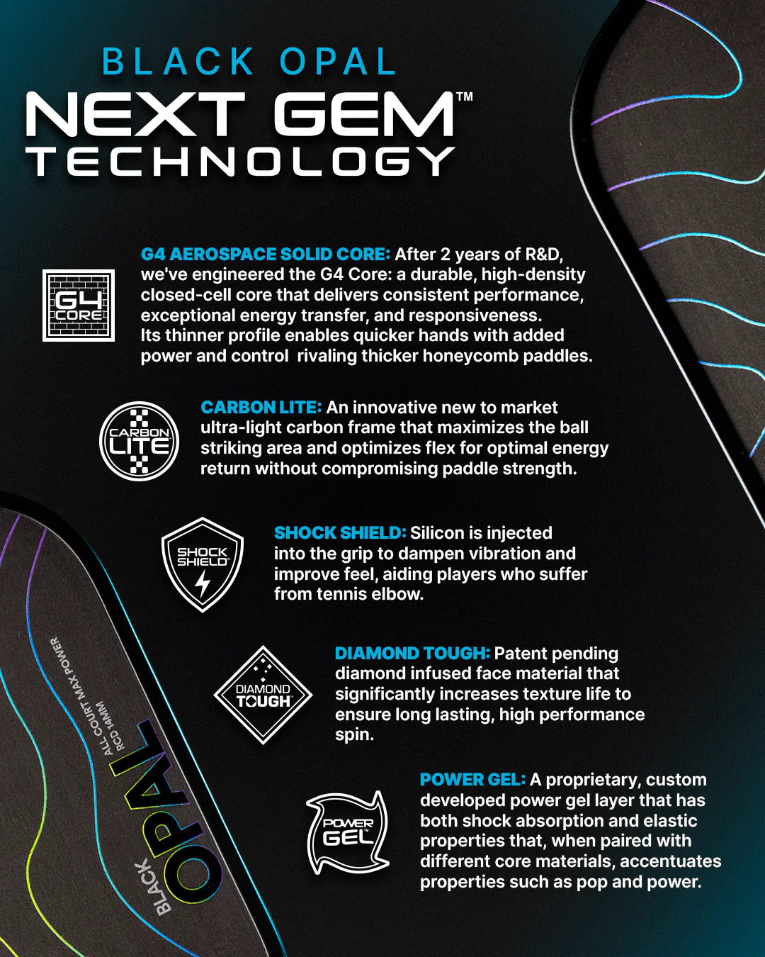 The Black Opal features our patent-pending Power Gel layer, engineered to amplify shot energy without compromising touch. This breakthrough design maximizes pop, adds depth to drives, and enhances precision at the net, giving you the edge in every exchange.