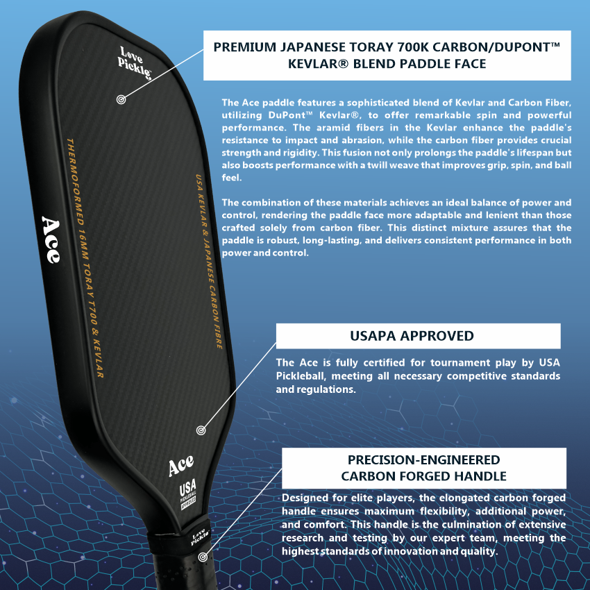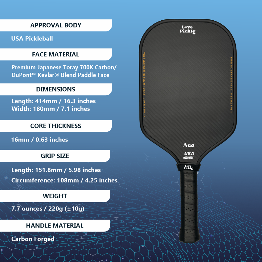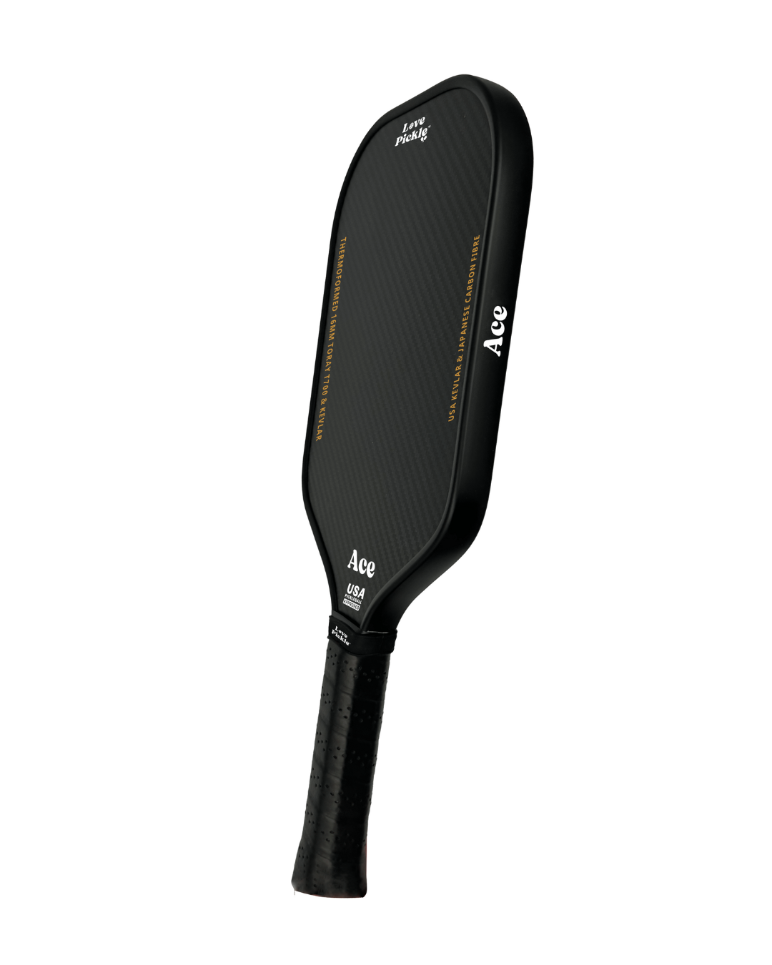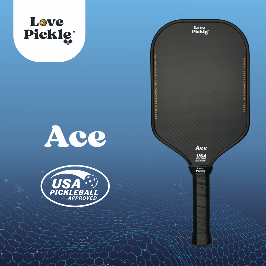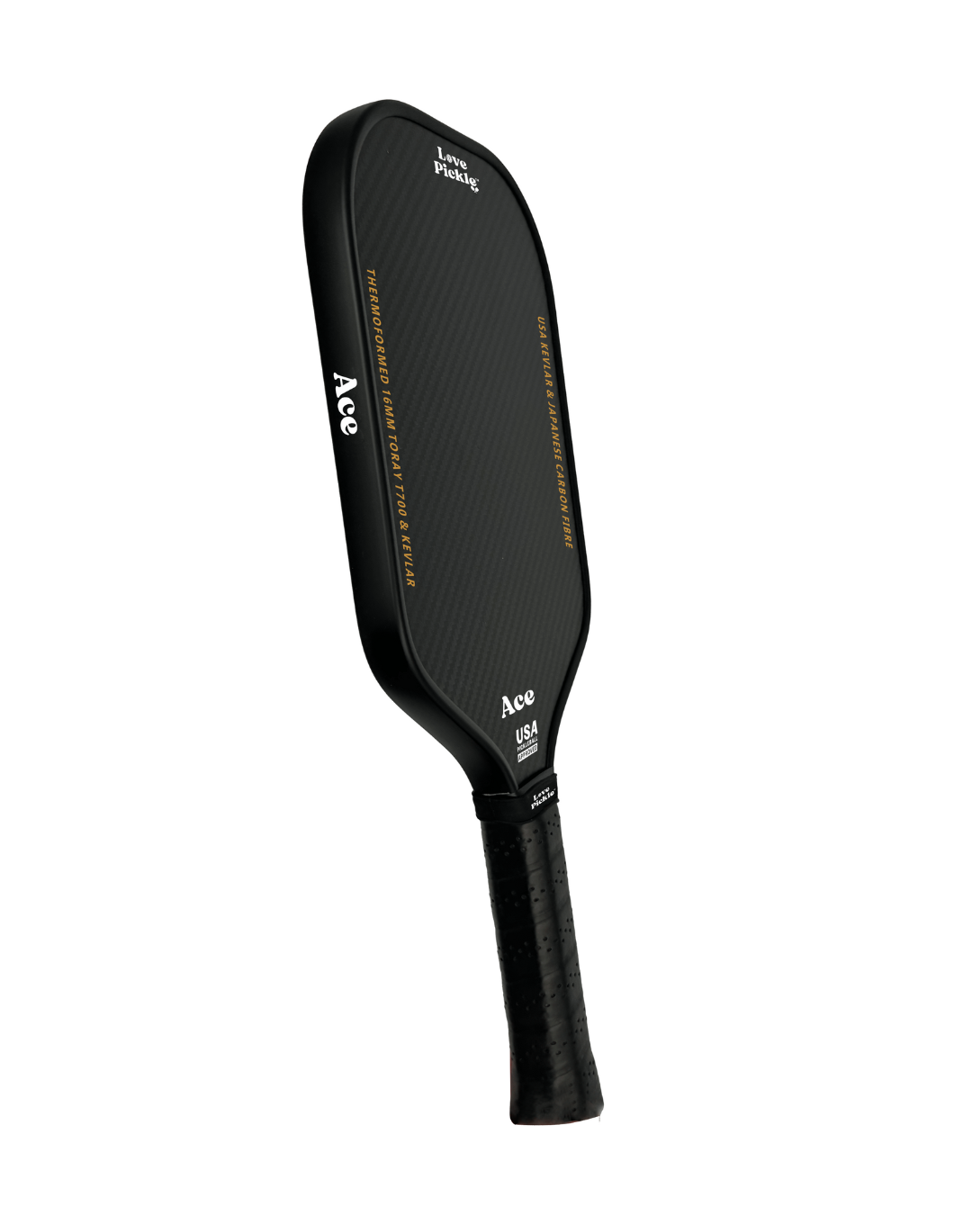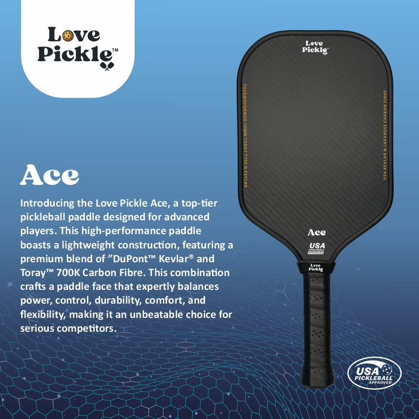 The Love Pickle Ace Pickleball paddle is a top-tier paddle designed with high performance features, making it an excellent choice for competitive players. The Ace features a lightweight construction, made with DuPont Kevlar and Toray 700k Carbon Fiber. This balances together to provide power, control, durability, comfort, and flexibility.