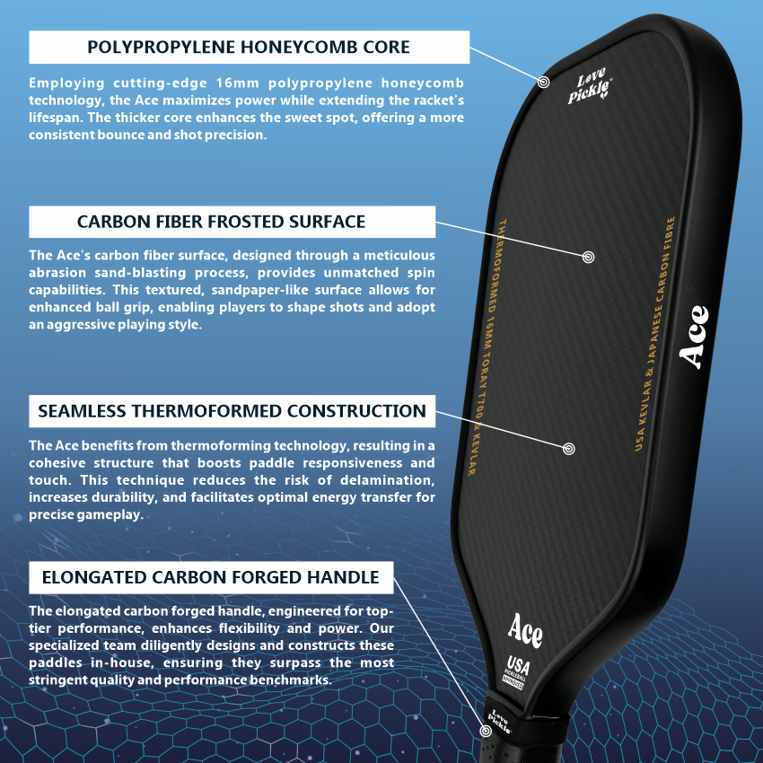 • Seamless Thermoformed Construction: The Ace benefits from thermoforming technology, resulting in a cohesive structure that boosts paddle responsiveness and touch. This technique reduces the risk of delamination, increases durability, and facilitates optimal energy transfer for precise gameplay.