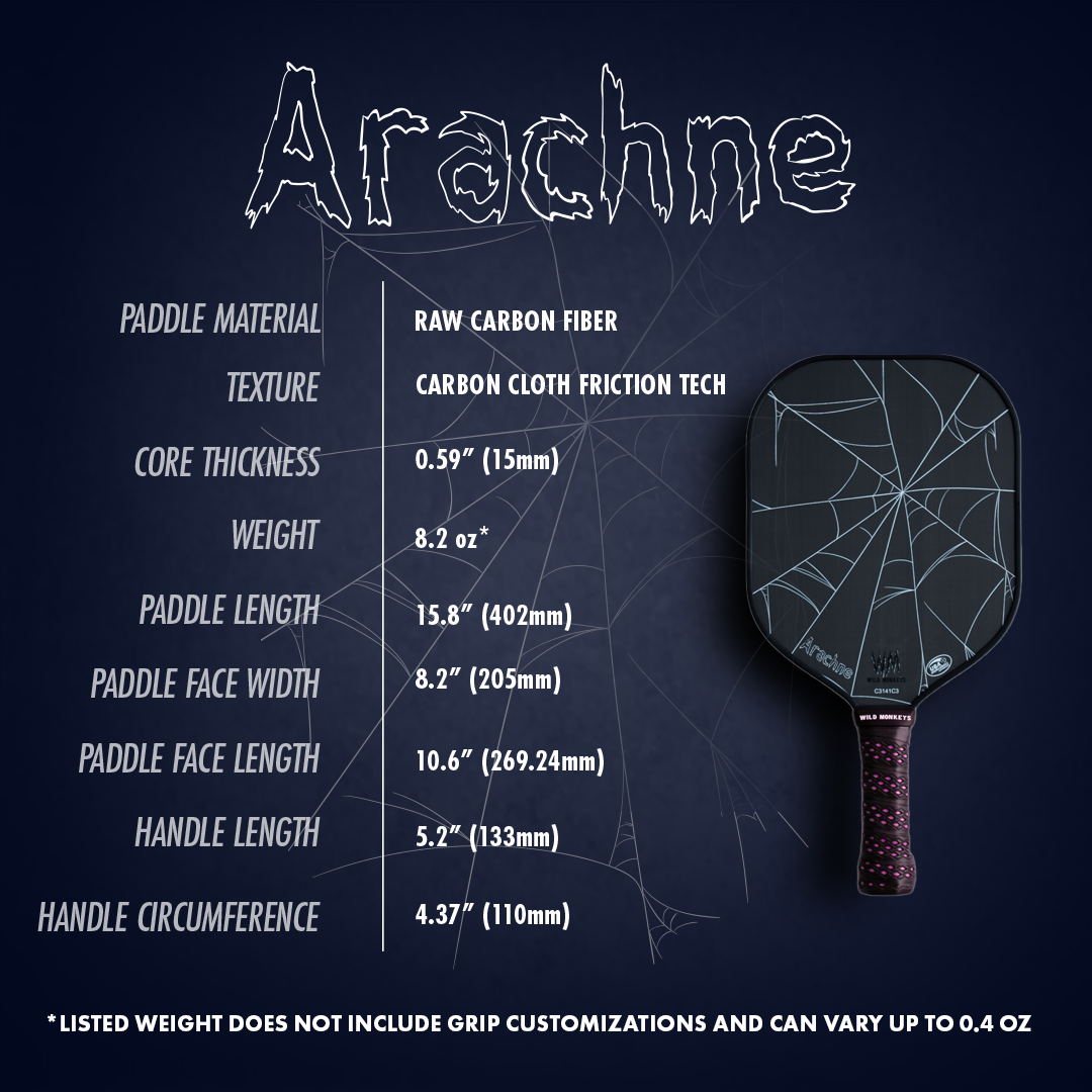 Tremendous balance and potential for maximum spin define this wide body paddle. It has a 15mm polymer honeycomb core and 5 in. handle, bringing players plenty of power and touch. Raw carbon fiber face enhanced by "carbon cloth" friction technology creates enough spin for this paddle to live up to its name. In Greek mythology, Arachne was a weaver so skilled in her ability she challenged, bested and enraged Athena, Goddess of war. Upon her death Arachne was changed into a spider.