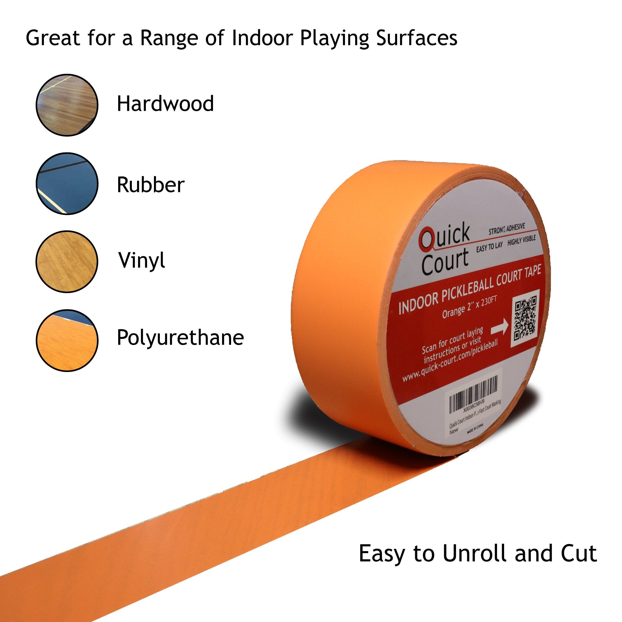 - The strong adhesive bonds well to a range of surfaces including hardwood, vinyl, rubber and gymnasium floors.